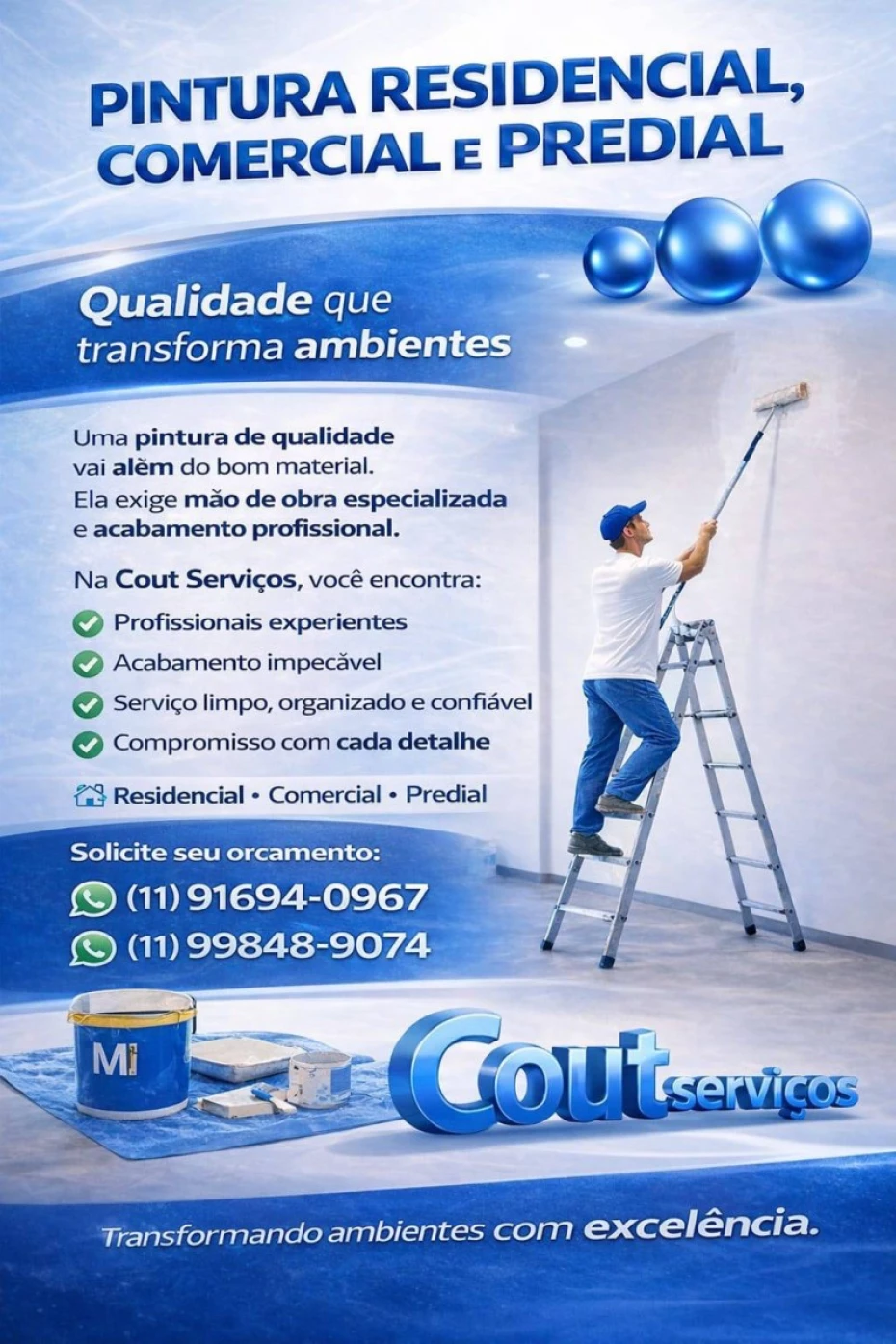 Cout Pintura é uma empresa dedicada a oferecer serviços de pintura predial, tanto em residências quanto em condomínios. Nossa missão é garantir a sua satisfação através de um trabalho de alta qualidade e profissionalismo.